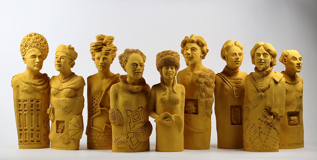 Série de sculptures dédiées au Théâtre qui représente des personnages du répertoire. Les bustes des personnages sont modelés avec humanité. Un jeu d’accessoires et de symboles permet d’identifier le rôle représenté par la silhouette. Chaque caractère se décrypte dans ce qu’il montre ou dans ce qu’il cache. Ces figures-rébus se détaillent avec humour, en références directes ou détournées selon le personnage représenté. La finition monochrome lumineuse mate est une transposition contemporaine des dorures des théâtres classiques.